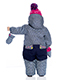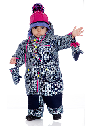 Специальная «шторка» на резинке внутри капюшона обеспечивает его максимальное прилегание к голове ребёнка и полностью исключает попадание холодного воздуха и снега в капюшон. Сам капюшон, а также варежки имеют флисовую подкладку и фиксируются на комбинезоне. Широкий клапан под молнией для дополнительного сохранения тепла. Тесёмка-утяжка на талии для большего прилегания комбинезона.