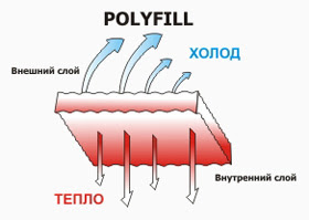 Polyfill изготавливается из полиэстерных волокон с применением латексного клея, что придаёт ему прочность, гибкость и упругость. Polyfill быстро восстанавливает свою форму после сжатия и долго сохраняет ее в процессе продолжительного использования одежды. Особые свойства волокна и латексного клея повышают объем, что позволяет материалу сохранять тепло при температуре -20 C.