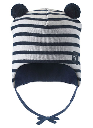 Легкая хлопковая шапочка с помпонами (100% хлопок) для мальчика. Внутри сплошная подкладка: приятный на ощупь хлопковый трикотаж с эластаном. В области ушей находятся ветрозащитные вставки.